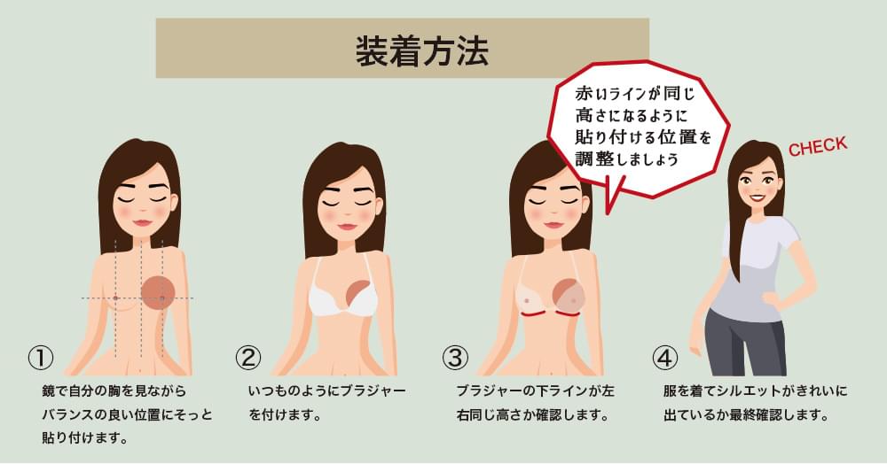 - ①鏡で自分の胸を見ながらバランスの良い位置にそっと貼り付けます。