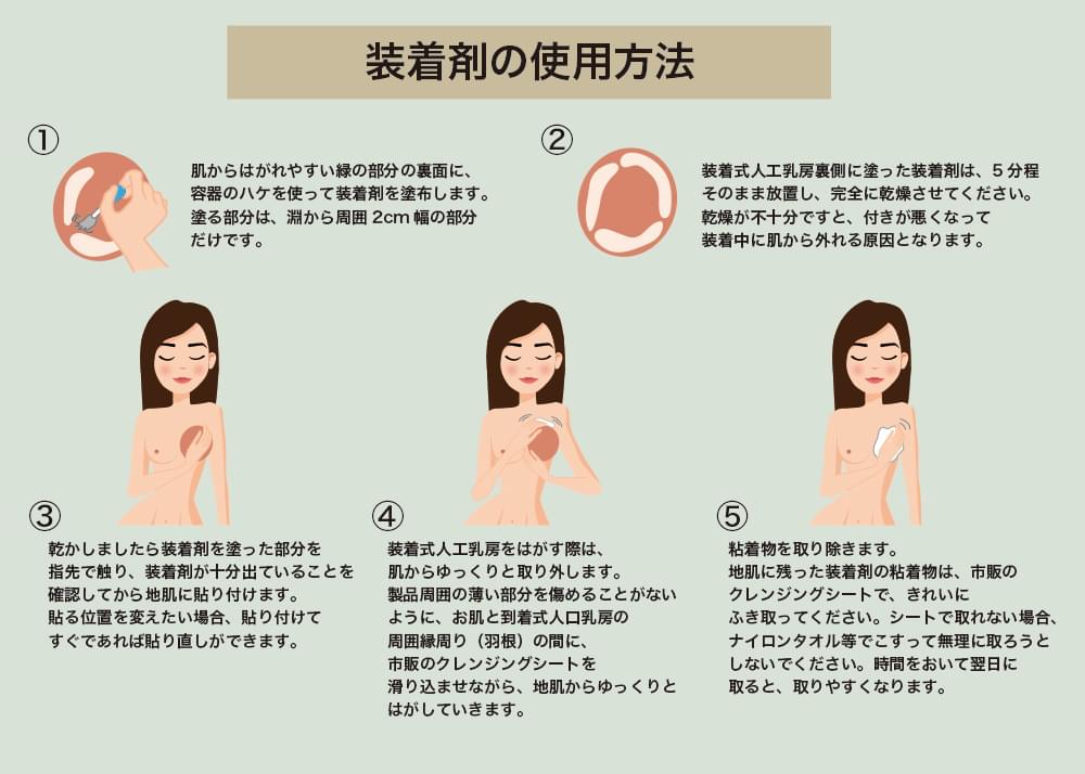 - ②装着式人工乳房裏側に塗った装着剤は、5分ほどそのまま放置し、完全に乾燥させてください。乾燥が不十分ですと、付きが悪くなって装着中に肌から外れる原因となります。