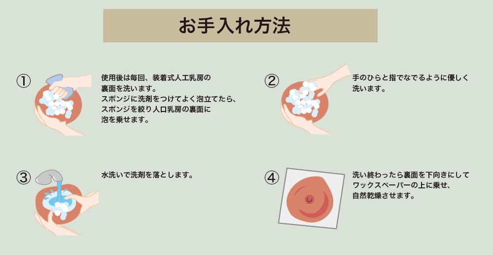 - ①使用後は毎回、装着式人工乳房の裏面を洗います。スポンジに洗剤をつけてよく泡立てたら、スポンジを絞り装着式人工乳房の裏面に泡を乗せます。